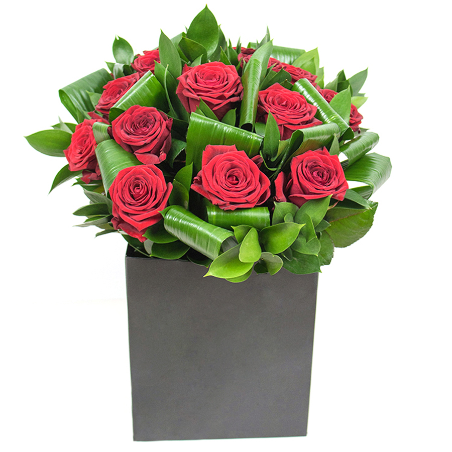 Experience the timeless beauty of our exquisite bouquet, featuring vibrant red roses, lush aspidistra leaves, and delicate ruscus. This stunning arrangement adds a touch of style and elegance to any space.